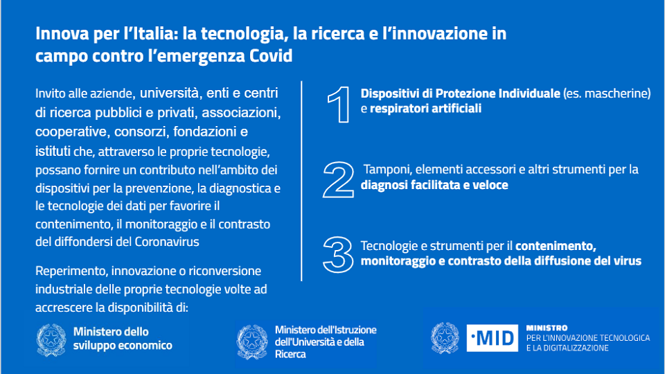 “Innova per l’Italia” è un invito alle aziende, università, enti e centri di ricerca pubblici e privati, associazioni, cooperative, consorzi, fondazioni e istituti che, attraverso le proprie tecnologie, possono fornire un contributo per la prevenzione, la diagnostica e il monitoraggio del Coronavirus (SARS-CoV-2) sull’intero territorio nazionale. Iniziativa congiunta di MISE, MID, Miur.